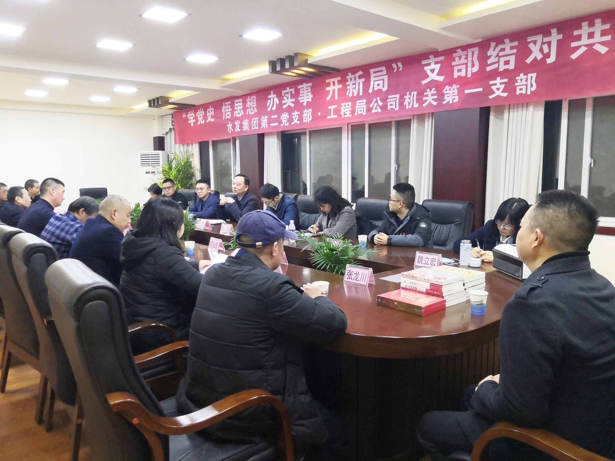 慰問結束后,兩支部展開座談交流會,雙方黨支部書記分別介紹了黨支部情況,并互贈黨史學習書籍。袁斌在談黨史學習體會中強調,要將學習十九屆六中全會精神和支部共建成果轉化為推動發(fā)展的動力,表示在水發(fā)集團的關心支持下,工程局公司有信心完成集團各項任務指標,打好年度收官戰(zhàn)。尹曉東分享了學習參觀陳毅故居的心得體會,希望大家學習傳承陳毅元帥堅定信仰艱苦奮斗的革命精神,鞠躬盡瘁死而后已的英雄氣概;學習領悟“十個堅持",深刻理解“兩個確立"的決定性意義,堅決做到“兩個維護";建立共建長效機制,發(fā)揮好支部戰(zhàn)斗堡壘作用和黨員先鋒模范作用,主動融入四川水利“3226"工作思路,扎實做好各項工作,以高質量黨建引領高質量發(fā)展,努力爭創(chuàng)一流省屬企業(yè)。