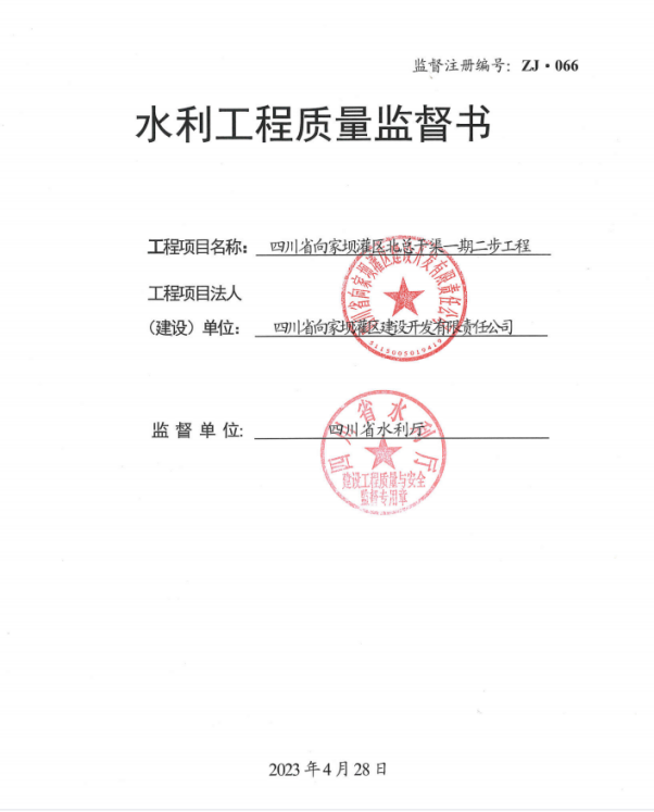4月28日,《四川省向家壩灌區一期二步工程質量監督書》(監督注冊編號:ZJ-066)正式下發至公司,標志著向家壩灌區北總干渠一期二步工程質量監督手續順利取得。