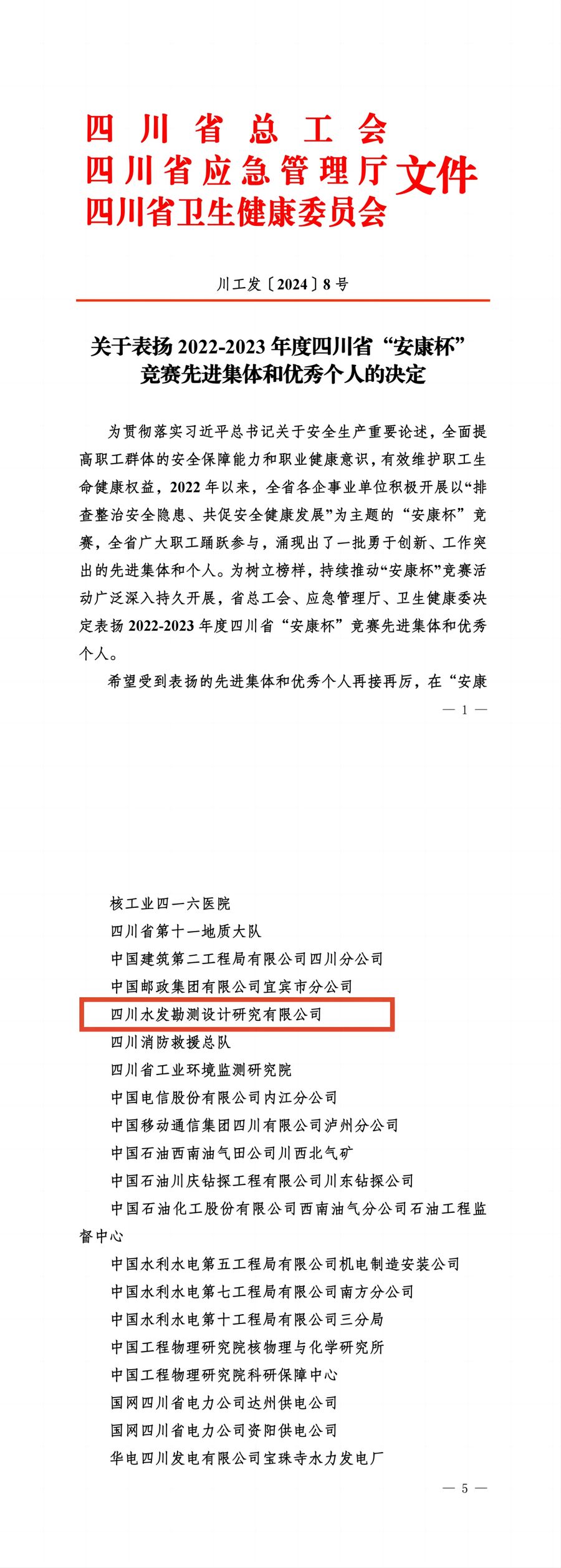 近日,四川省總工會、四川省應急管理廳、四川省衛生健康委員會聯合表揚2022—2023年度四川省“安康杯”競賽先進集體和優秀個人,設計公司獲得2022—2023年度四川省“安康杯”競賽先進集體。?