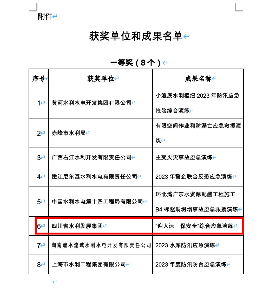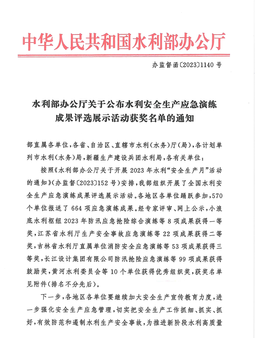 演練結束后,參演各方及時總結評估,組織專班編制演練視頻等資料,積極參加水利部辦公廳組織的2023年水利“安全生產月”應急演練成果評選,喜獲一等獎。