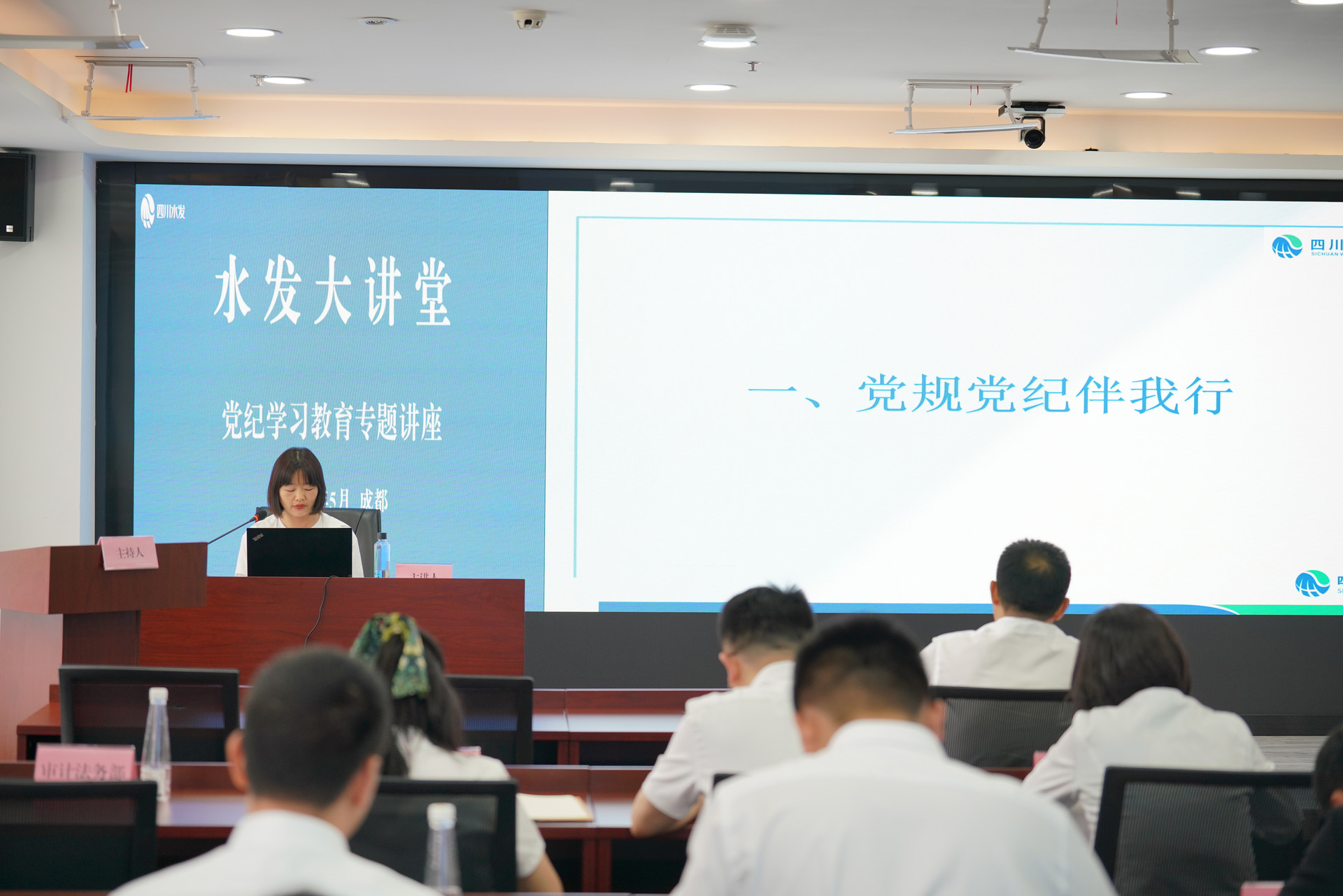 為深入學習貫徹新修訂的《中國共產黨紀律處分條例》,進一步強化黨紀法規意識,著力推進全面從嚴治黨,創新黨員干部理論學習的新載體、新路徑,5月17日,集團水發大講堂之“黨紀學習教育”第一期在集團總部開講。集團黨委副書記、董事、副總經理、總會計師尹曉東,集團黨委委員、紀委書記吳軍參加活動,集團總部、下屬企業黨員代表共計150余人通過線上、線下參加培訓。?