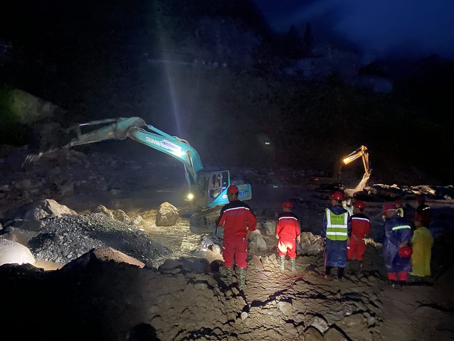 “時間就是生命!”應急搶險突擊隊的兩名現場指揮均參加過“5·12”汶川地震搶險工作,他們深知在大災大難面前,搶時間就是搶生命。山路坡陡彎急、崎嶇狹窄,加之狂風暴雨、碎石滾落,應急搶險隊決定分批輕裝前行。第一批隊員攜6 臺挖掘機、3臺裝載機于6時50分抵達馬烈鄉新華村。9時左右,68名隊員集結完畢。“就靠你們了啊!”漢源縣人民政府黨組成員、副指揮長李樹敏強壓著悲痛對第一支進駐搶險現場的四川水發應急搶險突擊隊分配搶險任務。