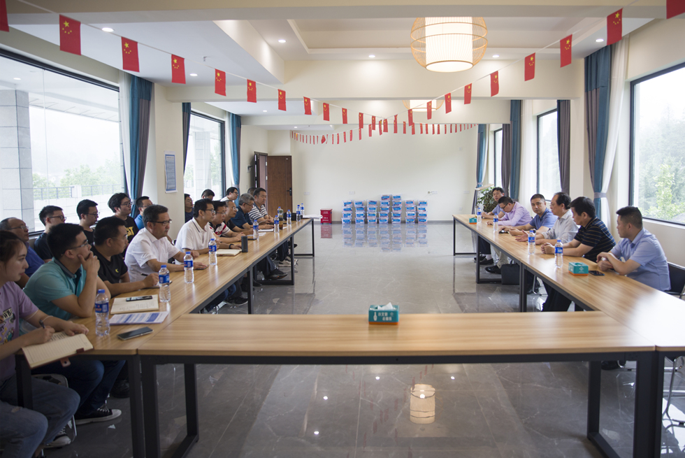 在雅安市名山區地勘一線,鐘杰和鄔清富向設計院公司勘察、測繪、物探人員送上了水發集團“夏送清涼”慰問包,并傳達了郭亨孝廳長、張強言副廳長對同志們的誠摯慰問。隨后,鐘杰一行來到邛崍市夾關鎮引大濟岷項目集中設計辦公點,看望慰問設計院公司抽調精兵強將組成的引大濟岷項目前期工作設計團隊并進行座談。座談會上,設計院公司副總經理、工會主席劉長升匯報了設計院公司工會及群團組織建設及工會組織為引大濟岷項目一線工作者做好服務保障的情況。周武平就引大濟岷項目前期設計工作情況作了詳細介紹:為高質量完成引大濟岷前期工作,設計院公司總工程師、副總經理高希章專項負責組建團隊,并抽調多名資深副總工程師及100余名技術骨干組成技術團隊,采取地勘人員分散作業、設計人員集中辦公模式,打響引大濟岷前期工作攻堅戰。