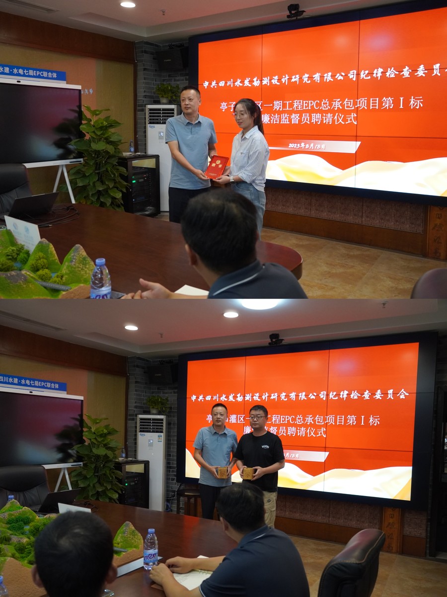 公司紀檢監(jiān)察部負責人宣讀了公司紀委《關(guān)于聘任亭子口灌區(qū)EPC總承包項目第Ⅰ、Ⅱ標廉潔監(jiān)督員的通知》,姚磊為2個標段廉潔監(jiān)督員頒發(fā)聘書,廉潔監(jiān)督員伍代富、顧楠作了表態(tài)發(fā)言。