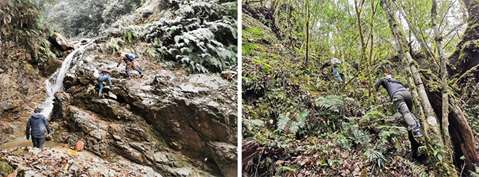 2021年12月的一天,勘察分院麥高飛同志與其他同志早上7點天未亮就起床去腳基坪電站廠房接向導(林場護林員),8點30分在溝口架設好RTK基站后,他們和兩名向導就沿著泥石流溝(黃沙溝)順溝而上,沿途雨雪交加,雪越下越大,到處都是陡坎跌水與溪流,在向導帶領下,他們四肢并用攀爬在亂石遍布的溝谷,經過不懈的努力,終于在中午兩點左右測放完粽隧ZK2號深孔。饑寒交迫的他們在附近的小溪邊冒雪草草吃了幾口自熱方便飯后,就立即返程。于晚上6點30分左右安全到達腳基坪電站附近的318國道邊,共用時10個小時。在上山的路上,汗水濕透了內衣,雨雪打濕了外套,放孔后的他們被寒風吹得瑟瑟發抖,艱難到達318國道邊后,累得癱坐在公路邊的值班車上,只想坐下來好好休息。這僅僅是麥高飛同志進行地質勘察工作的一個縮影!這也是麥高飛同志的工作日常!