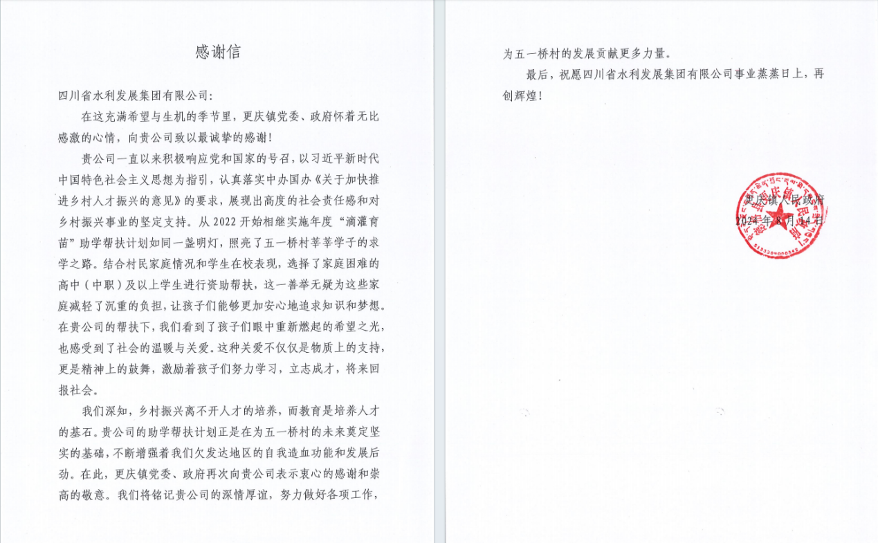 “在貴公司的幫扶下,我們看到了孩子們眼中重新燃起 的希望之光,也感受到了社會的溫暖與關愛?!苯?,集團收到了來自托底幫扶德格縣所屬更慶鎮人民政府的一封感謝信,信中更慶鎮黨委政府提到集團實施的“滴灌育苗”助學幫扶計劃如同一盞明燈,照亮了五一橋村莘莘學子的求學之路,增強了五一橋村的自我造血功能和發展后勁。
